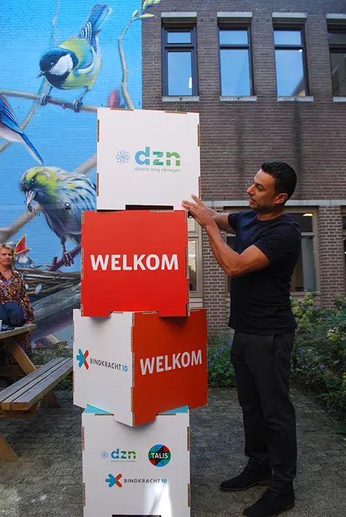 Bindkracht10 en Talis verhuisden vorig jaar al naar het pand aan de Boekweitweg. “Door samen te wonen met maatschappelijke organisaties op het gebied van wonen, werken, welzijn en zorg kunnen we meerwaarde bieden voor de mensen waarvoor we werken”, vertelt Ronald Leushuis, bestuurder Talis. DZN biedt zorg op maat aan jongvolwassenen met een (licht) verstandelijke beperking. Bestuurder Saïd Echargui van Directe Zorg Nijmegen (DZN): “Deze verhuizing van ons hoofdkantoor helpt ons in het werk. We vinden het belangrijk dat medewerkers en cliënten zo weinig mogelijk hinder ervaren van mogelijke schotten tussen organisaties. Door samen te wonen met Talis en Bindkracht10 hopen we dit te verbeteren. We kijken hier enorm naar uit.” Bindkracht10 en Talis werken inmiddels bijna een jaar samen in het nieuwe kantoor. “Doordat we samen onder een dak zitten, zijn de lijntjes nog korter”, vertelt Mohamed El Hamdaoui, bestuurder Bindkracht10. Het afgelopen jaar is de onderlinge samenwerking versterkt, onder meer door gezamenlijke werkgroepen. Die gingen over energiearmoede, schone leefomgeving, meedoen en ontmoeten. In hun werk is bindkracht10 verweven in de stad, dichtbij mensen en organisaties. Mohamed El Hamdaoui: “Dat vinden we hier ook in het kantoor. Een plek waar je kan samen komen en werken: met elkaar, bewoners en de stad.” Het komende jaar wordt ook de verbinding met het WerkBedrijf versterkt. Letterlijk. Er wordt gewerkt aan een doorgang tussen beide kantoren. Het werkbedrijf is de schakel tussen werkgevers in de regio en mensen met een kwetsbare positie op de arbeidsmarkt. Samen dragen de organisaties eraan bij dat mensen een dak boven het hoofd hebben, volwaardig kunnen meedoen aan de samenleving, zorg kunnen ontvangen in buurten en wijken waar mensen prettig kunnen leven. Het kantoor staat in de Winkelsteeg; een nieuwe ontwikkelgebied in Nijmegen dat zal veranderen in een levendige wijk met verbindingen naar Dukenburg, Neerbosch en Hatert. De nieuwe woningen van NDW21 zijn hierin een eerste stap.